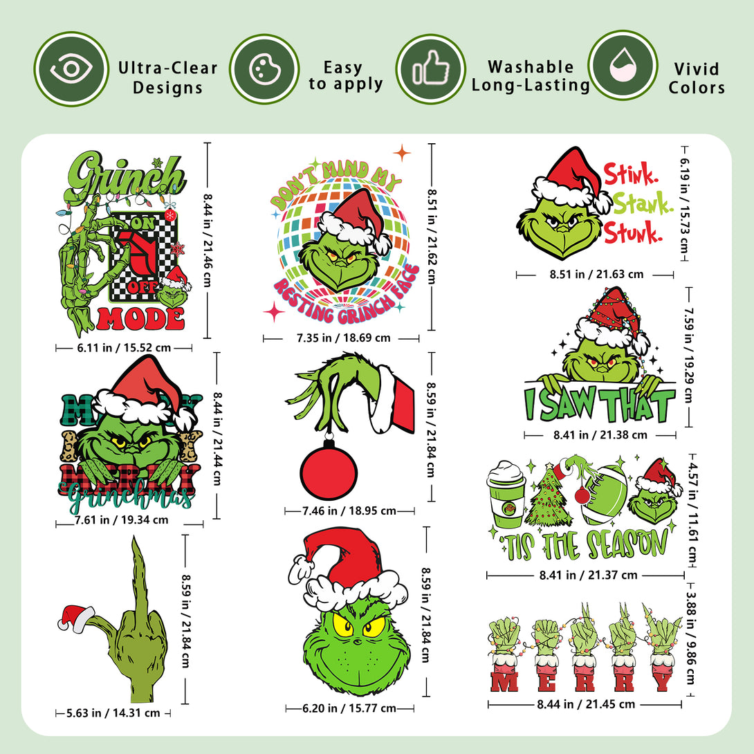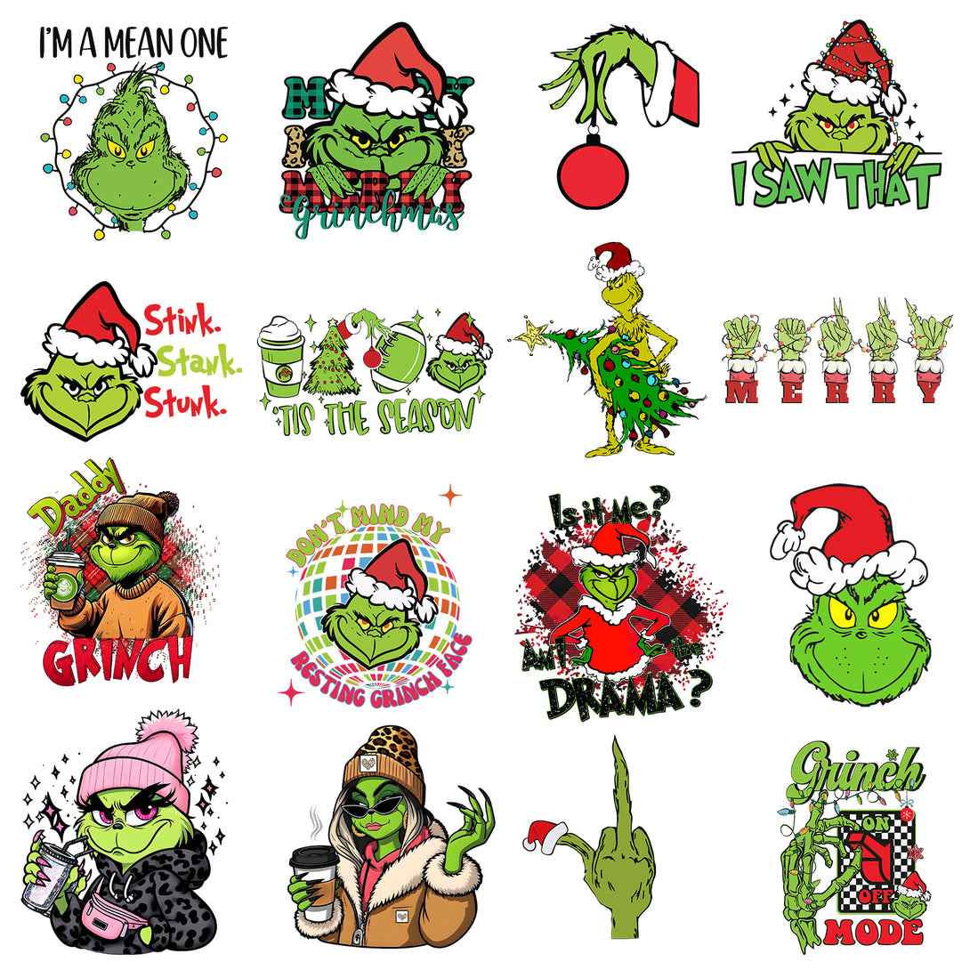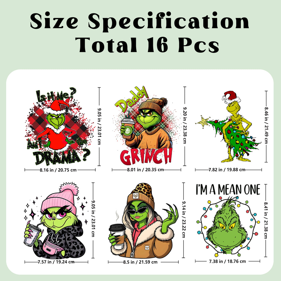 Tintnut Grinch Christmas DTF Transfers Ready to Press Iron on Transfers-16 Sheets Grinch Pattern Iron on Decals for T-Shirts Clothing Heat Transfer Iron on Stickers for Canvas Bag Design