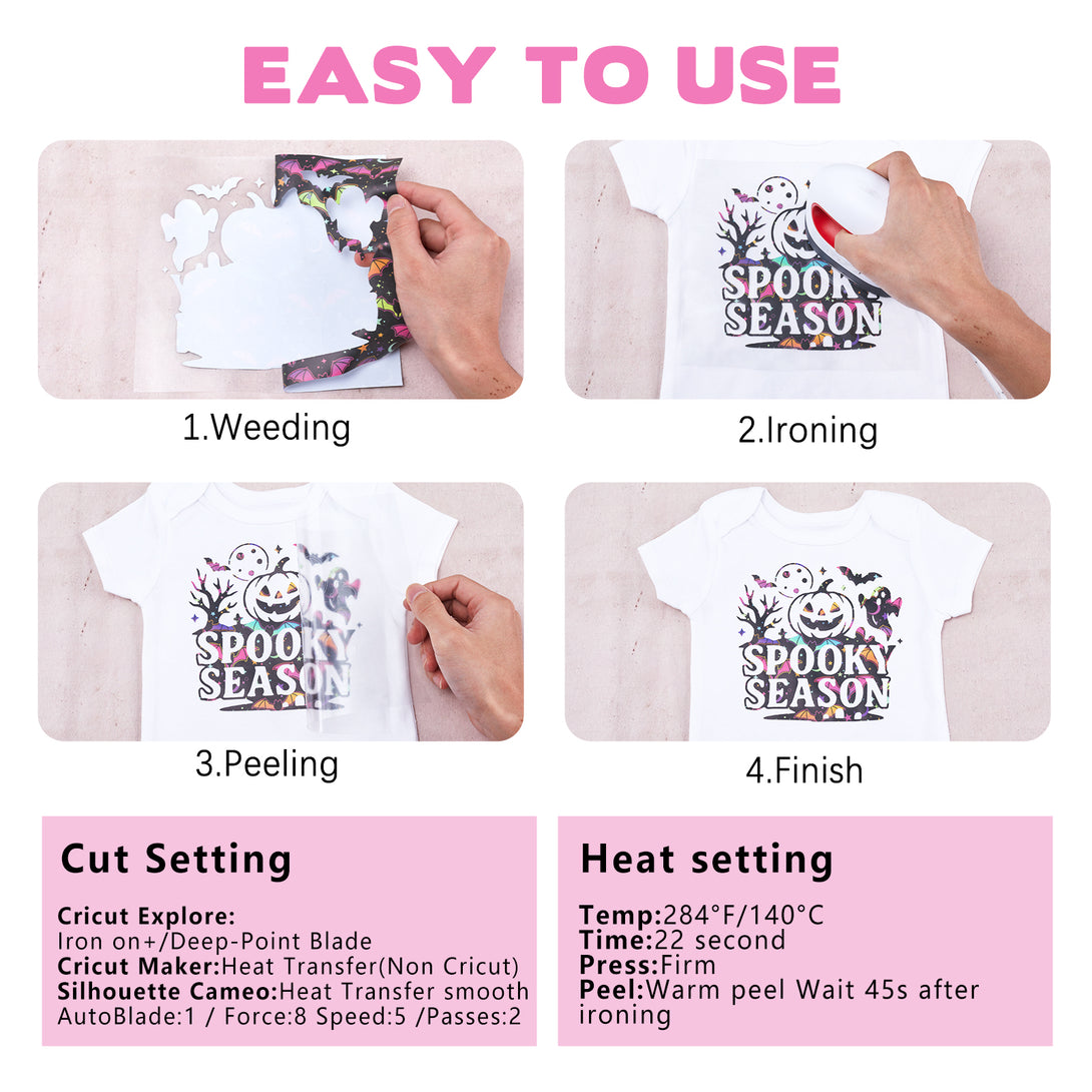【Soft and Flexible】Our Color Changing glitter heat transfer vinyl is made with a smooth and shinny glitter film that makes it easy to stretch and apply on different fabrics. It is perfect for stretching t-shirts, and safe for use even on garments for all ages.