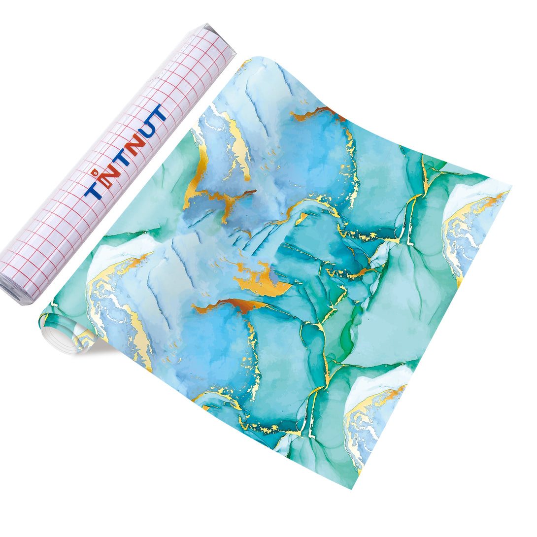 Tintnut Marble Permanent Vinyl, Blue Green Marble Adhesive Vinyl Sheets, Watercolor Gold Pattern Self Sticker Water proofing Vinyl