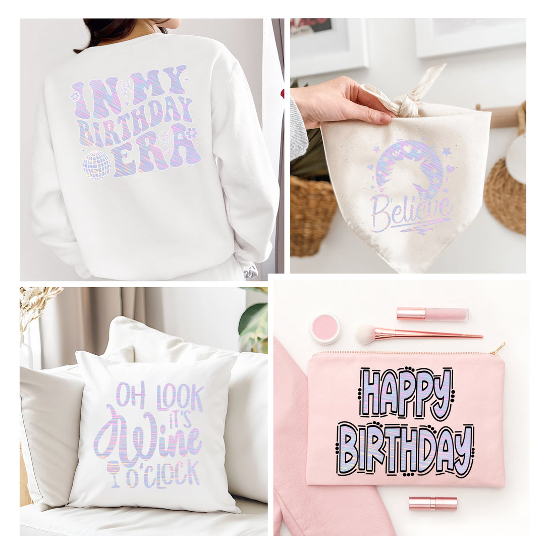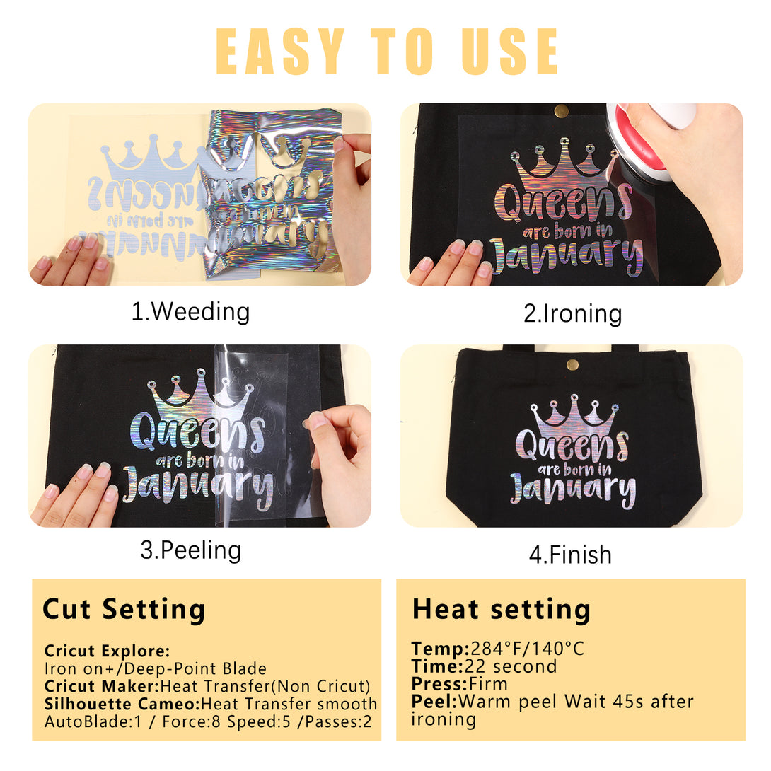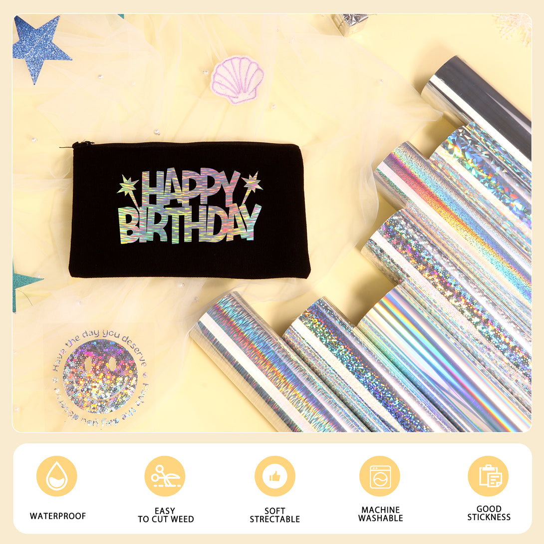 - 【REFLECTIVE CHROME EFFECT】The Chrome Foil and Metallic Foil Holographic HTV Combo adds a shimmering chrome sheen to your designs! The mirror-like chrome effect and the rainbow-like spectrum of colors make your project stand out. Use it to create unique and chic gifts for your loved ones.