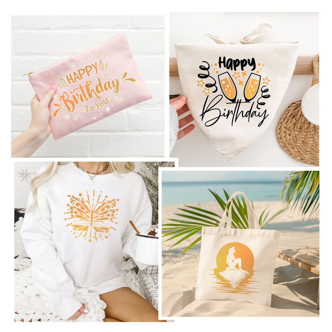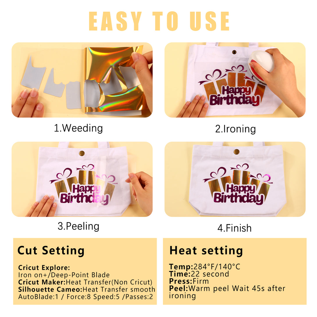 - 【REFLECTIVE CHROME EFFECT】The Chrome Foil and Metallic Foil Holographic HTV Combo adds a shimmering chrome sheen to your designs! The mirror-like chrome effect and the rainbow-like spectrum of colors make your project stand out. Use it to create unique and chic gifts for your loved ones.