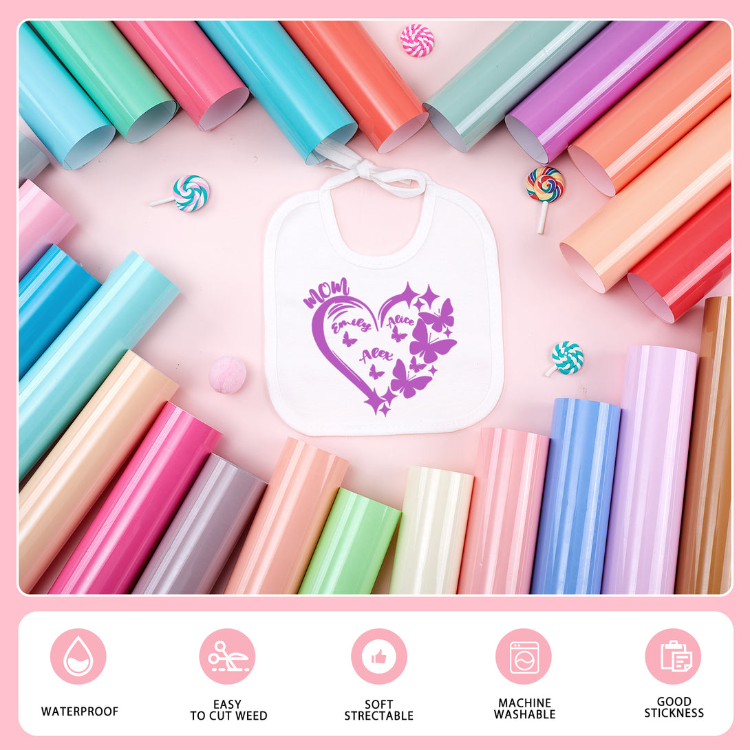 - 【FRIENDLY TO USE】This heat transfer vinyl is easy to cut on any cutting machines. It is aslo design to be easy weed. You can heat firmly with heat press machine and also normal iron to transfer