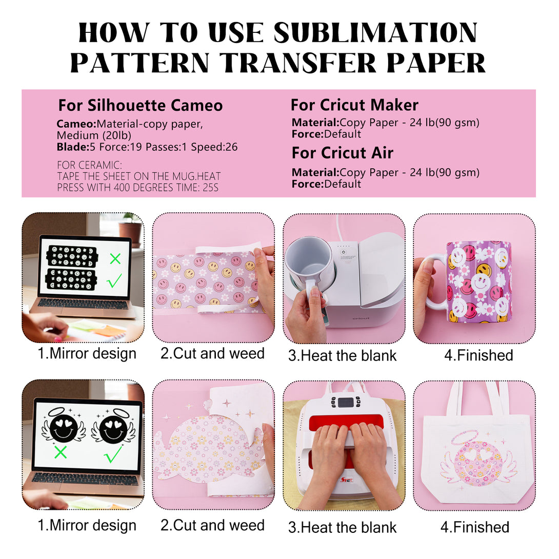 - 【Easy to Cut and Transfer】Our sublimation transfer sheets can easily weed and transfer your design and perfectly suited most machine.The most important,our product are convenience that is simple and easy to transfer and use.