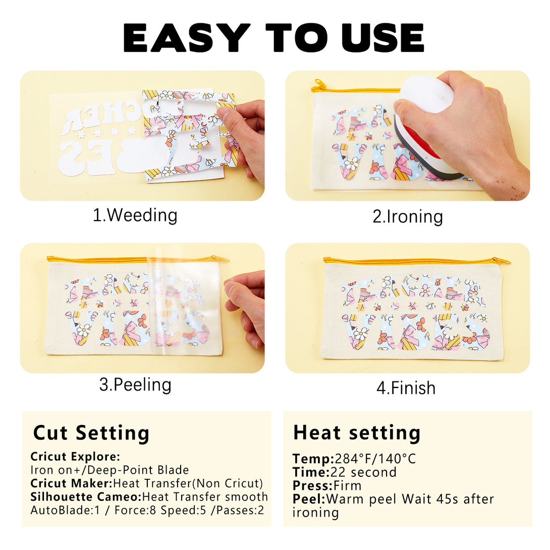 【FRIENDLY TO USE】This heat transfer vinyl is easy to cut on any cutting machines. It is aslo design to be easy weed. You can heat firmly with heat press machine and also normal iron to transfer.