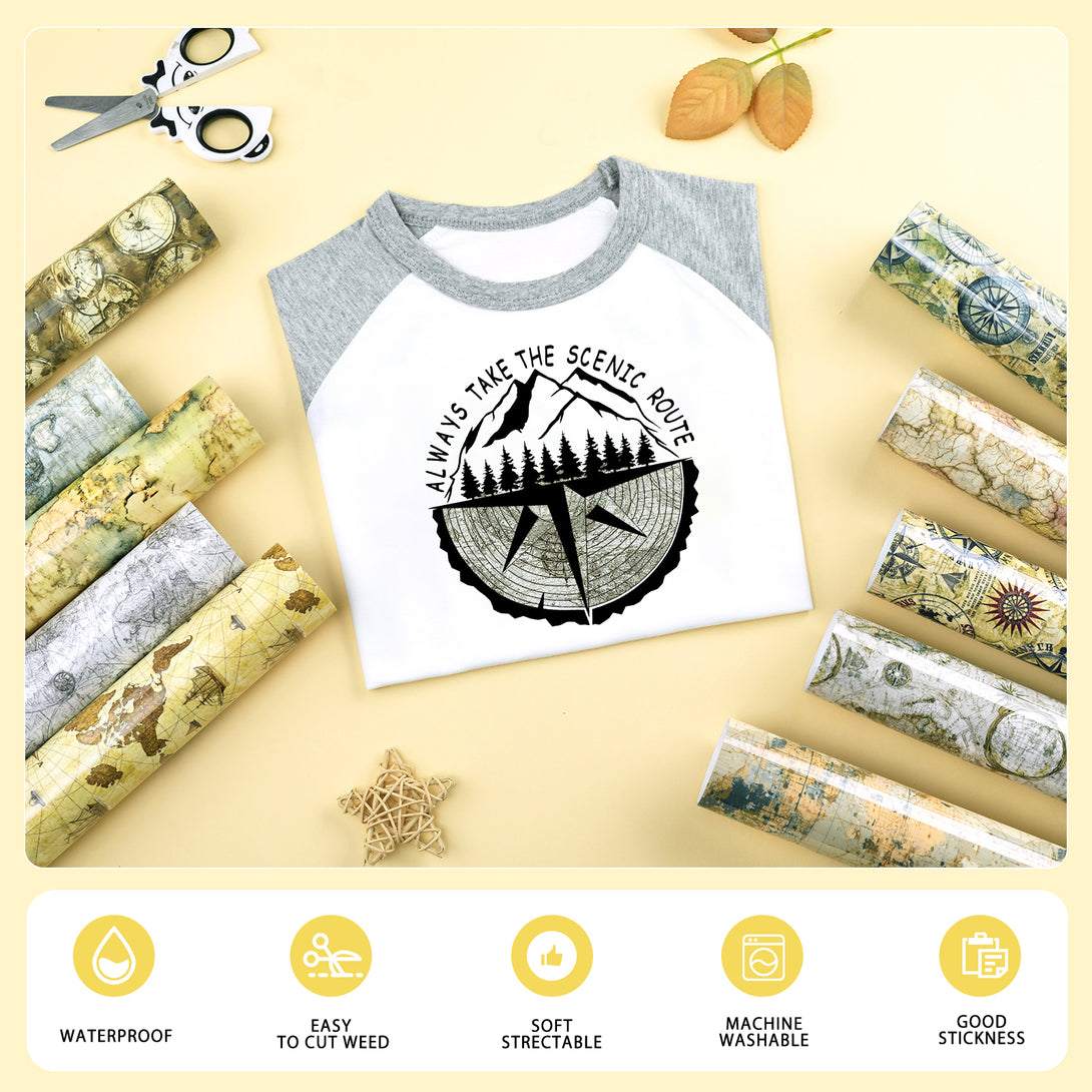 Tintnut Vintage Map Gray Retro Map Pattern Heat Transfer Vinyl Patterned HTV for Fabric Iron on Vinyl for T-Shirts